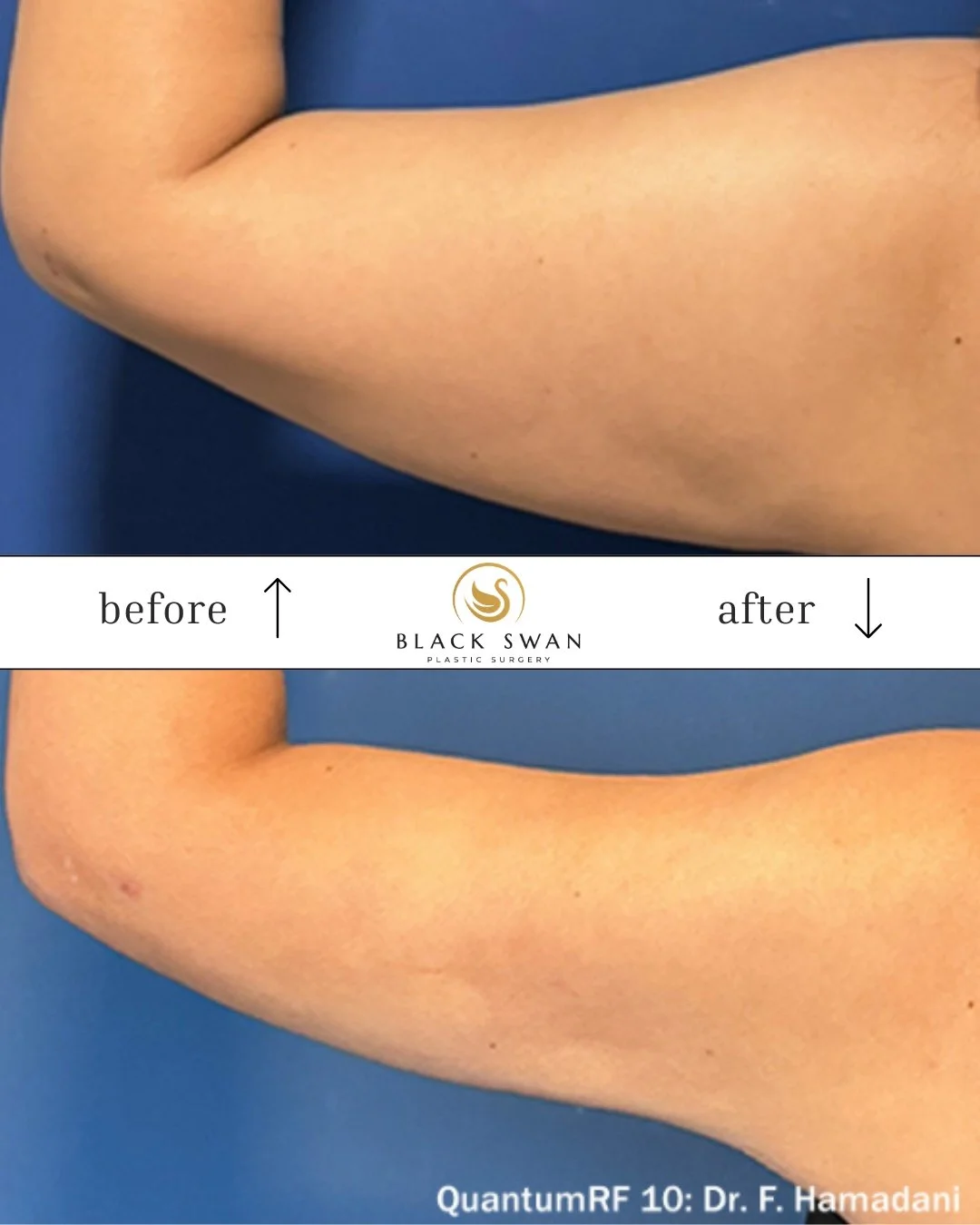 QuantumRF is minimally invasive and uses internal radiofrequency to melt fat and tighten skin. While Quantum can actually be combined with liposuction to further enhance results, it can also be performed on its own - without the need for full surgery or general anesthesia. You're awake, it's quick, and there are no big incisions or recovery period.